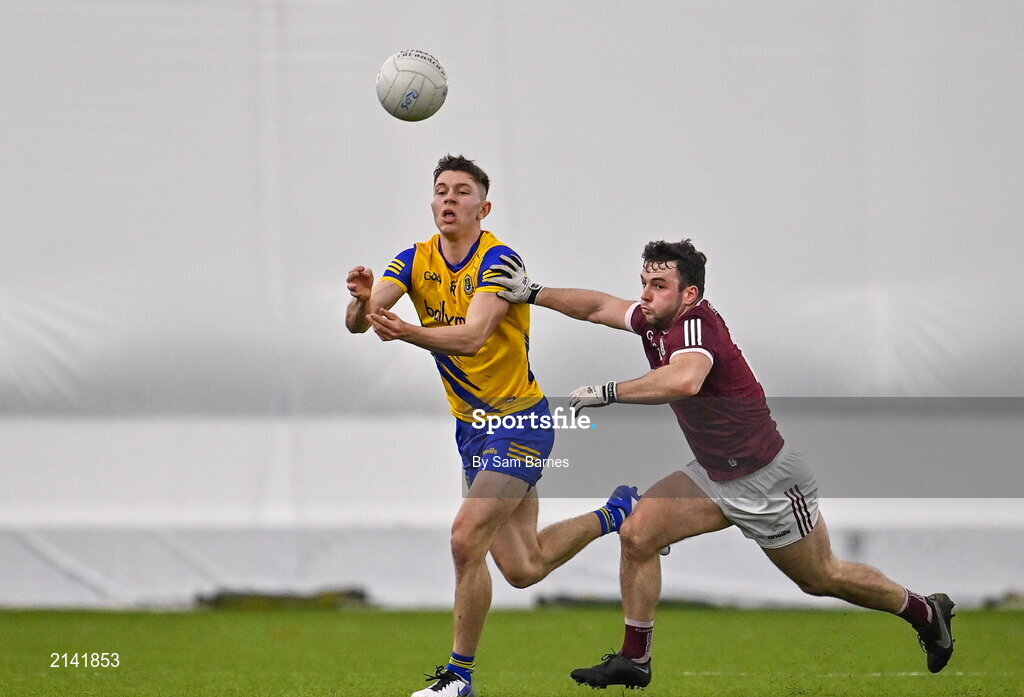 14 January 2022; Ciaran Lawless of Roscommon in action against Dessie Conneely of Galway during the Connacht FBD League Final match between Galway and Roscommon at NUI Galway Connacht Air Dome in Bekan, Mayo. Photo by Sam Barnes/Sportsfile