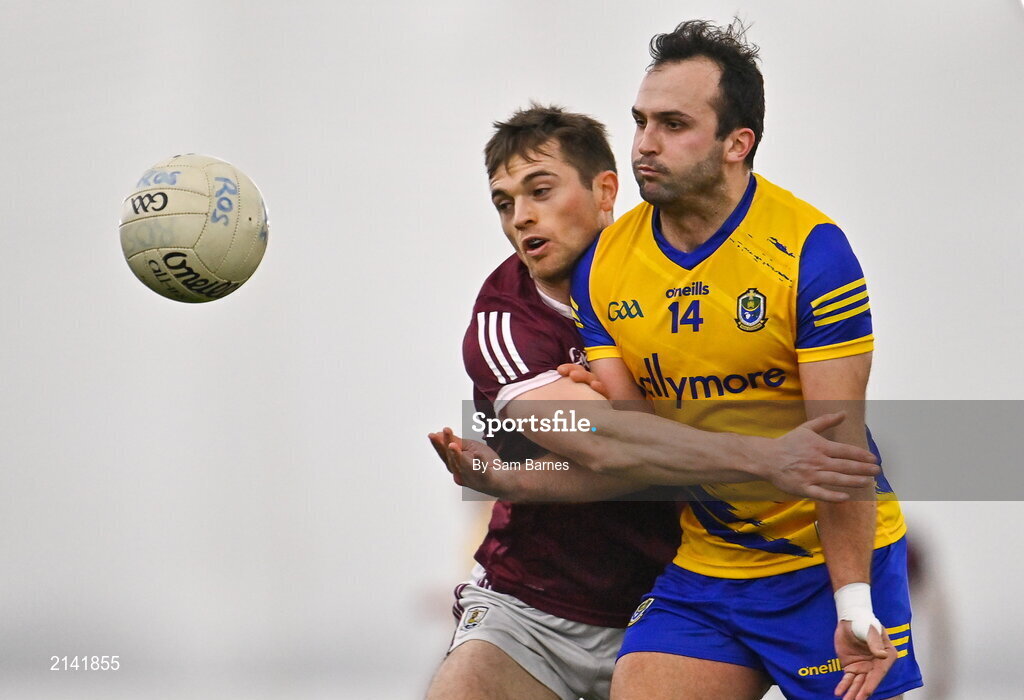 14 January 2022; Donie Smith of Roscommon in action against Liam Silke of Galway during the Connacht FBD League Final match between Galway and Roscommon at NUI Galway Connacht Air Dome in Bekan, Mayo. Photo by Sam Barnes/Sportsfile