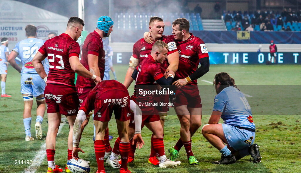 14 January 2022; Gavin Coombes of Munster, centre, celebrates with teammate Chris Farrell after scoring their side's late winning try during the Heineken Champions Cup Pool B match between Castres Olympique and Munster at Stade Pierre Fabre in Castres, France. Photo by Manuel Blondeu/Sportsfile