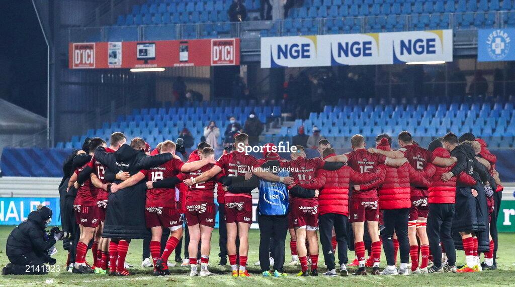 14 January 2022; The Munster team huddle after the Heineken Champions Cup Pool B match between Castres Olympique and Munster at Stade Pierre Fabre in Castres, France. Photo by Manuel Blondeu/Sportsfile