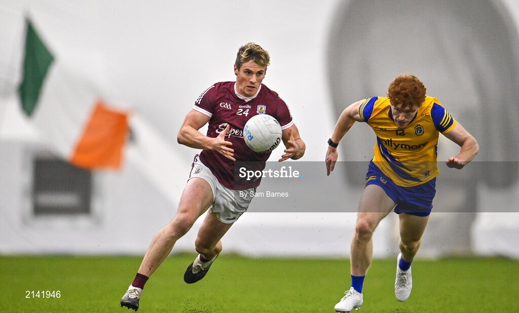 14 January 2022; Shane Walsh of Galway in action against Diarmuid McGann of Roscommon during the Connacht FBD League Final match between Galway and Roscommon at NUI Galway Connacht Air Dome in Bekan, Mayo. Photo by Sam Barnes/Sportsfile