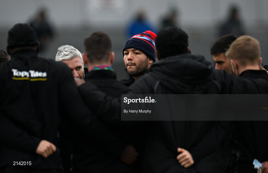15 January 2022; Leicester Tigers captain Ellis Genge in the team huddle before the Heineken Champions Cup Pool B match between Connacht and Leicester Tigers at The Sportsground in Galway. Photo by Harry Murphy/Sportsfile