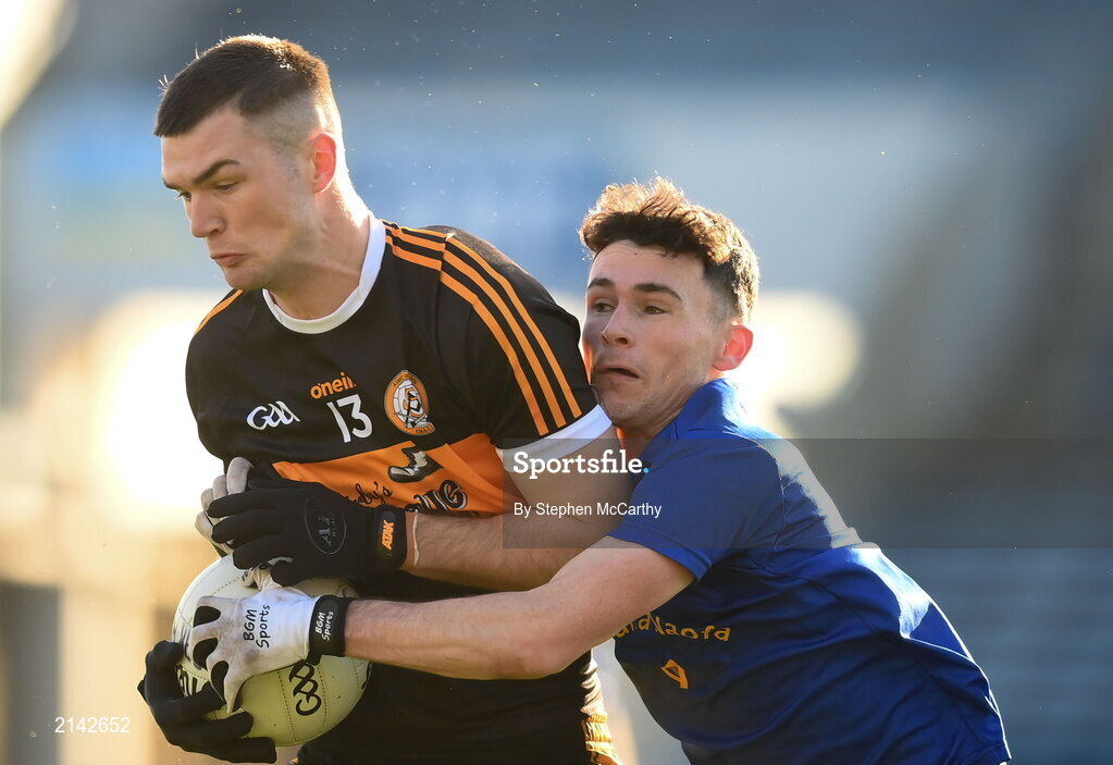 16 January 2022; Sean Quilter of Austin Stacks in action against Colm Scully of St Finbarr's during the AIB Munster GAA Football Senior Club Championship Final match between Austin Stacks and St Finbarr's at Semple Stadium in Thurles, Tipperary. Photo by Stephen McCarthy/Sportsfile