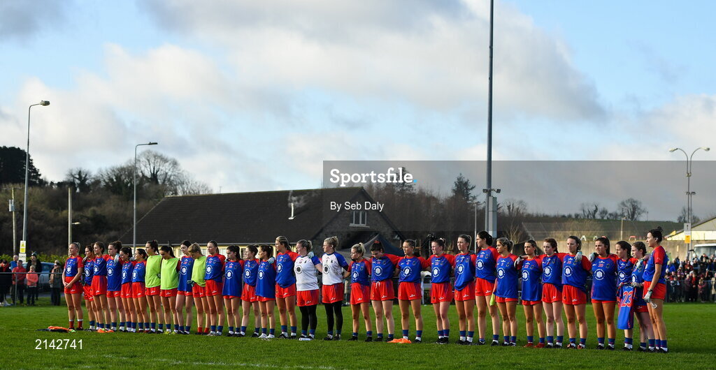 16 January 2022; St Peter's Dunboyne players observe a minute's in memory of the late Ashling Murphy before the 2021 currentaccount.ie All-Ireland Ladies Senior Club Football Championship semi-final match between Mourneabbey and St Peter's Dunboyne at Clyda Rovers GAA, in Cork. Photo by Seb Daly/Sportsfile