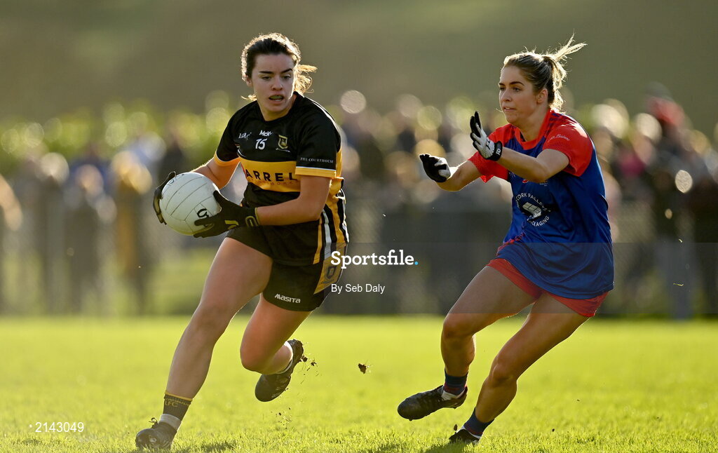 16 January 2022; Laura Fitzgerald of Mourneabbey in action against Elaine Doyle of St Peter's Dunboyne during the 2021 currentaccount.ie All-Ireland Ladies Senior Club Football Championship semi-final match between Mourneabbey and St Peter's Dunboyne at Clyda Rovers GAA, in Cork. Photo by Seb Daly/Sportsfile