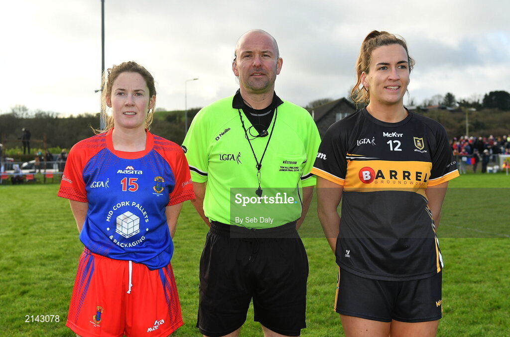 16 January 2022; Referee Jonathan Murphy with team captains Fiona O'Neill of St Peter's Dunboyne, left, and Brid O'Sullivan of Mourneabbey before the 2021 currentaccount.ie All-Ireland Ladies Senior Club Football Championship semi-final match between Mourneabbey and St Peter's Dunboyne at Clyda Rovers GAA, in Cork. Photo by Seb Daly/Sportsfile