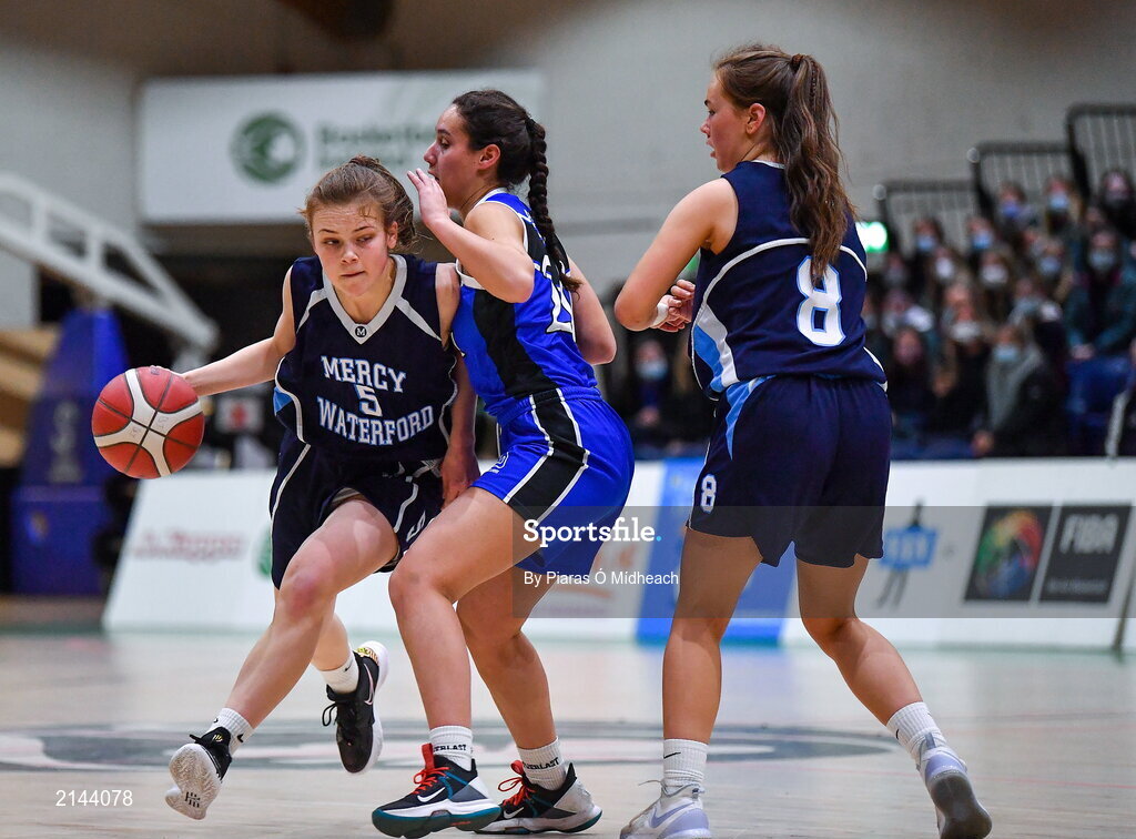 19 January 2022; Caitlin Gloeckner of Our Lady of Mercy in action against Giulia Anderlini of Loreto Abbey Dalkey during the Pinergy Basketball Ireland U19 A Girls Schools Cup Final match between Loreto Abbey Dalkey, Dublin, and Our Lady of Mercy, Waterford, at the National Basketball Arena in Dublin. Photo by Piaras Ó Mídheach/Sportsfile