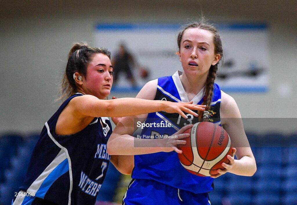 19 January 2022; Ailbhe Ryan of Loreto Abbey Dalkey in action against Ardiana Shallci of Our Lady of Mercy during the Pinergy Basketball Ireland U19 A Girls Schools Cup Final match between Loreto Abbey Dalkey, Dublin, and Our Lady of Mercy, Waterford, at the National Basketball Arena in Dublin. Photo by Piaras Ó Mídheach/Sportsfile