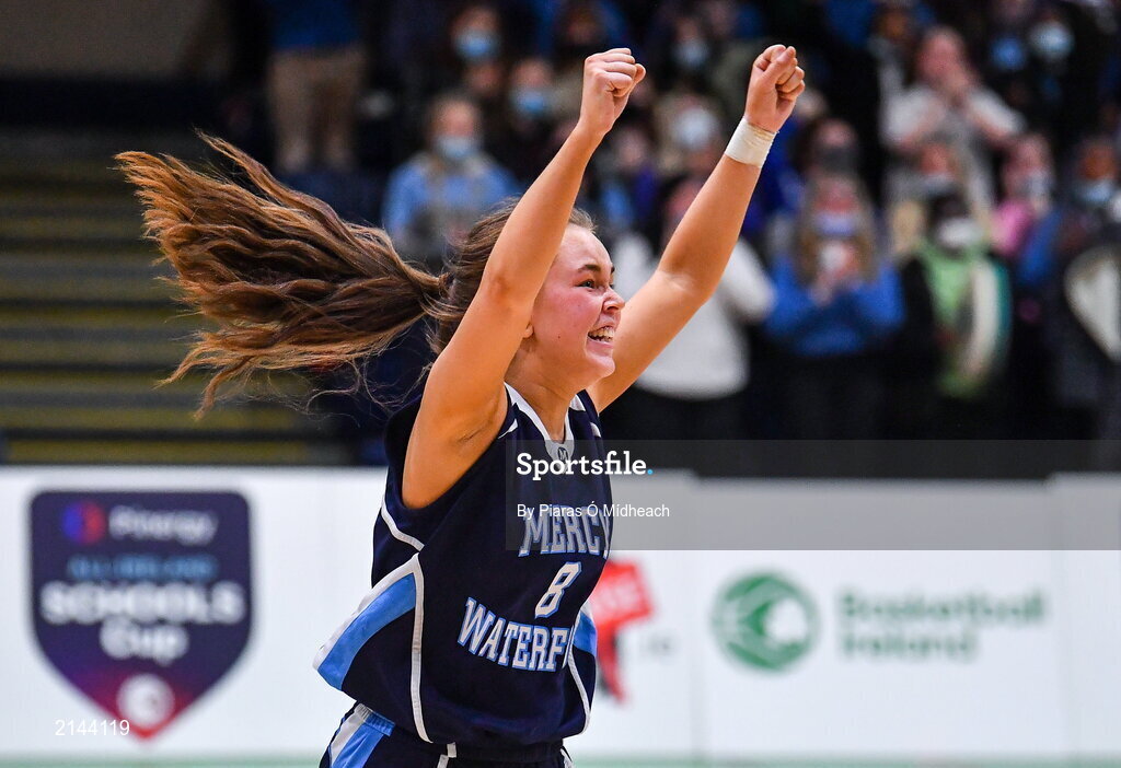 19 January 2022; Illana Fitzgerald Our Lady of Mercy celebrates after her side's victory in the Pinergy Basketball Ireland U19 A Girls Schools Cup Final match between Loreto Abbey Dalkey, Dublin, and Our Lady of Mercy, Waterford, at the National Basketball Arena in Dublin. Photo by Piaras Ó Mídheach/Sportsfile