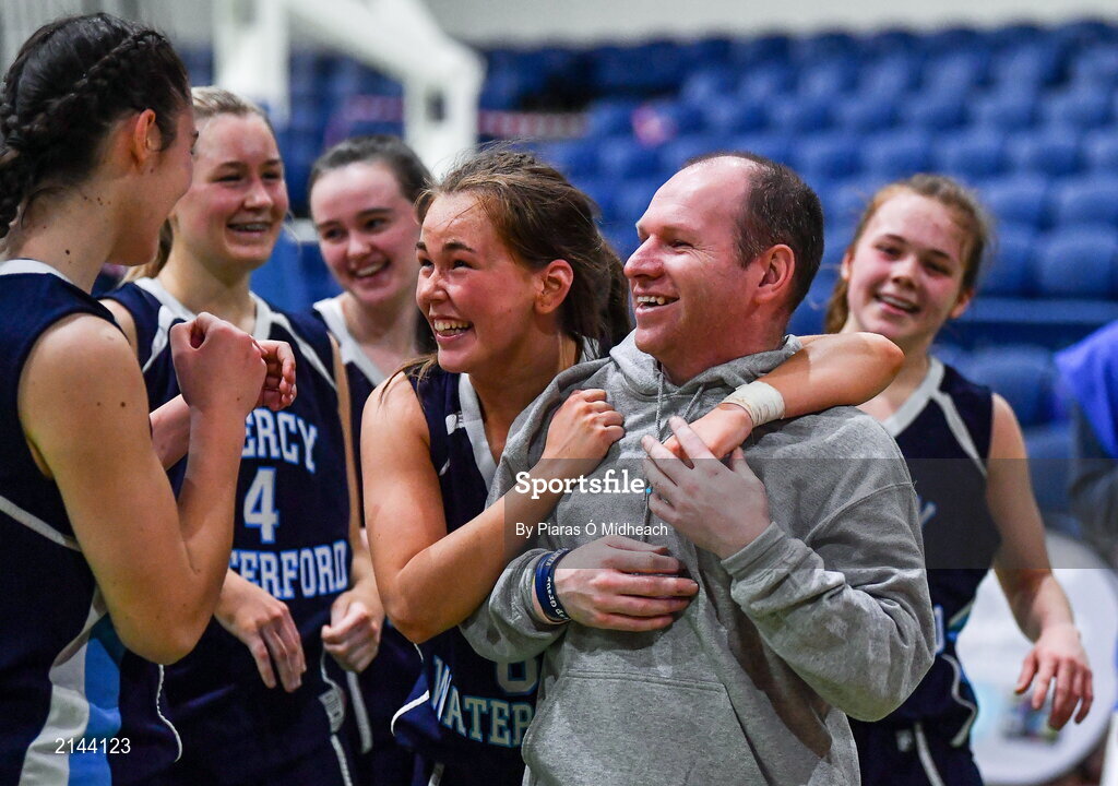 19 January 2022; Our Lady of Mercy players celebrate with her coach Tommy O'Mahony after their side's victory in the Pinergy Basketball Ireland U19 A Girls Schools Cup Final match between Loreto Abbey Dalkey, Dublin, and Our Lady of Mercy, Waterford, at the National Basketball Arena in Dublin. Photo by Piaras Ó Mídheach/Sportsfile
