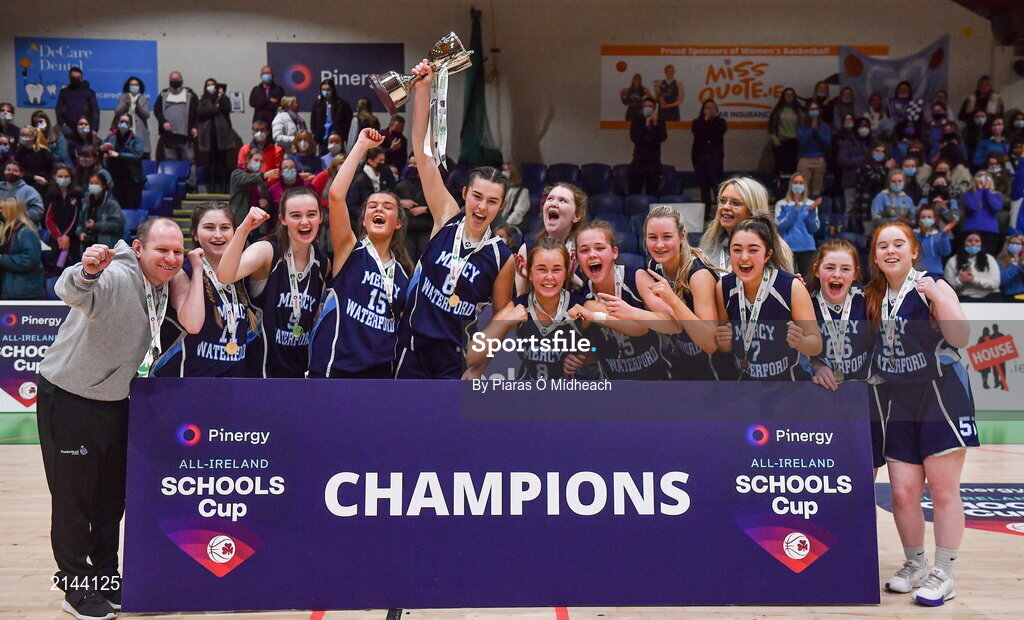 19 January 2022; Our Lady of Mercy captain Sarah Hickey lifts the cup as her team celebrate after their side's victory in the Pinergy Basketball Ireland U19 A Girls Schools Cup Final match between Loreto Abbey Dalkey, Dublin, and Our Lady of Mercy, Waterford, at the National Basketball Arena in Dublin. Photo by Piaras Ó Mídheach/Sportsfile