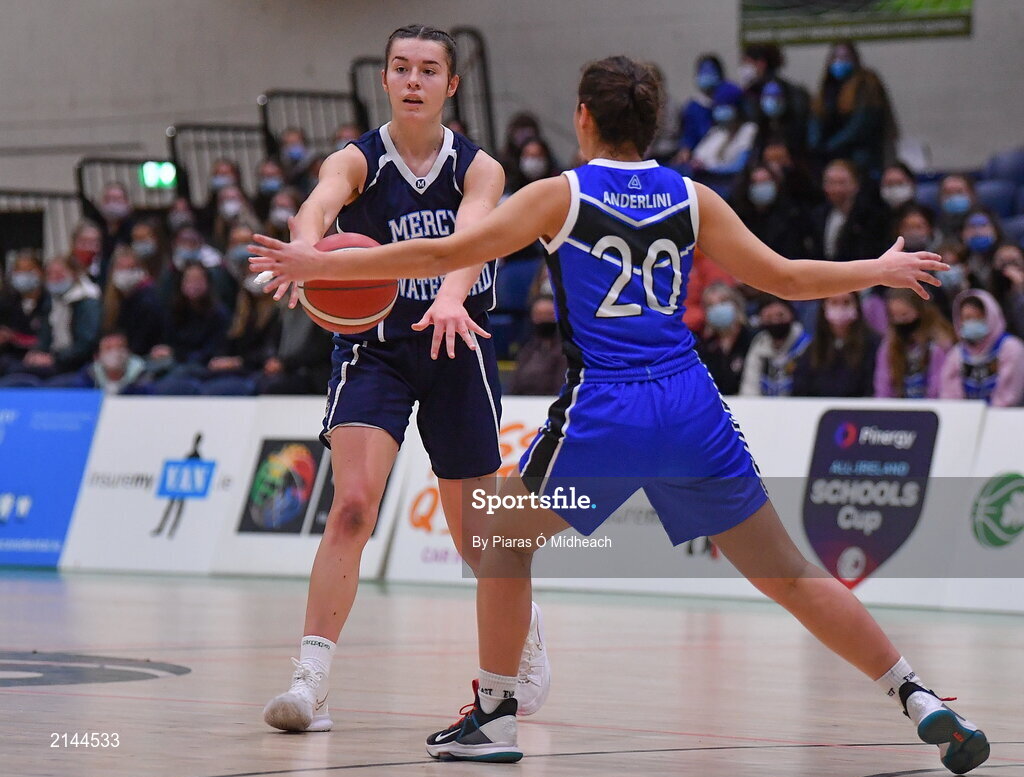 19 January 2022; Sarah Hickey Our Lady of Mercy in action against Giulia Anderlini of Loreto Abbey Dalkey during the Pinergy Basketball Ireland U19 A Girls Schools Cup Final match between Loreto Abbey Dalkey, Dublin, and Our Lady of Mercy, Waterford, at the National Basketball Arena in Dublin. Photo by Piaras Ó Mídheach/Sportsfile