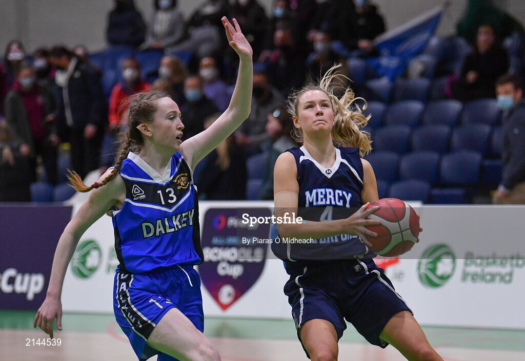 19 January 2022; Orla Dullaghan Our Lady of Mercy in action against Ailbhe Ryan of Loreto Abbey Dalkey during the Pinergy Basketball Ireland U19 A Girls Schools Cup Final match between Loreto Abbey Dalkey, Dublin, and Our Lady of Mercy, Waterford, at the National Basketball Arena in Dublin. Photo by Piaras Ó Mídheach/Sportsfile