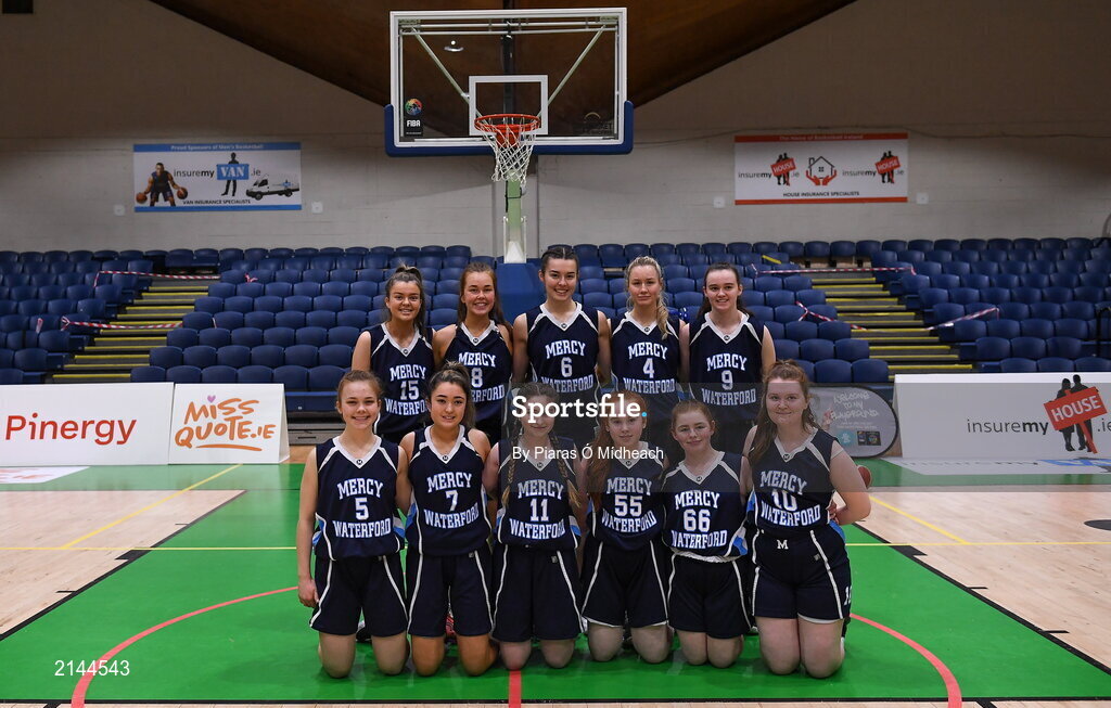 19 January 2022; The Our Lady of Mercy squad before the Pinergy Basketball Ireland U19 A Girls Schools Cup Final match between Loreto Abbey Dalkey, Dublin, and Our Lady of Mercy, Waterford, at the National Basketball Arena in Dublin. Photo by Piaras Ó Mídheach/Sportsfile