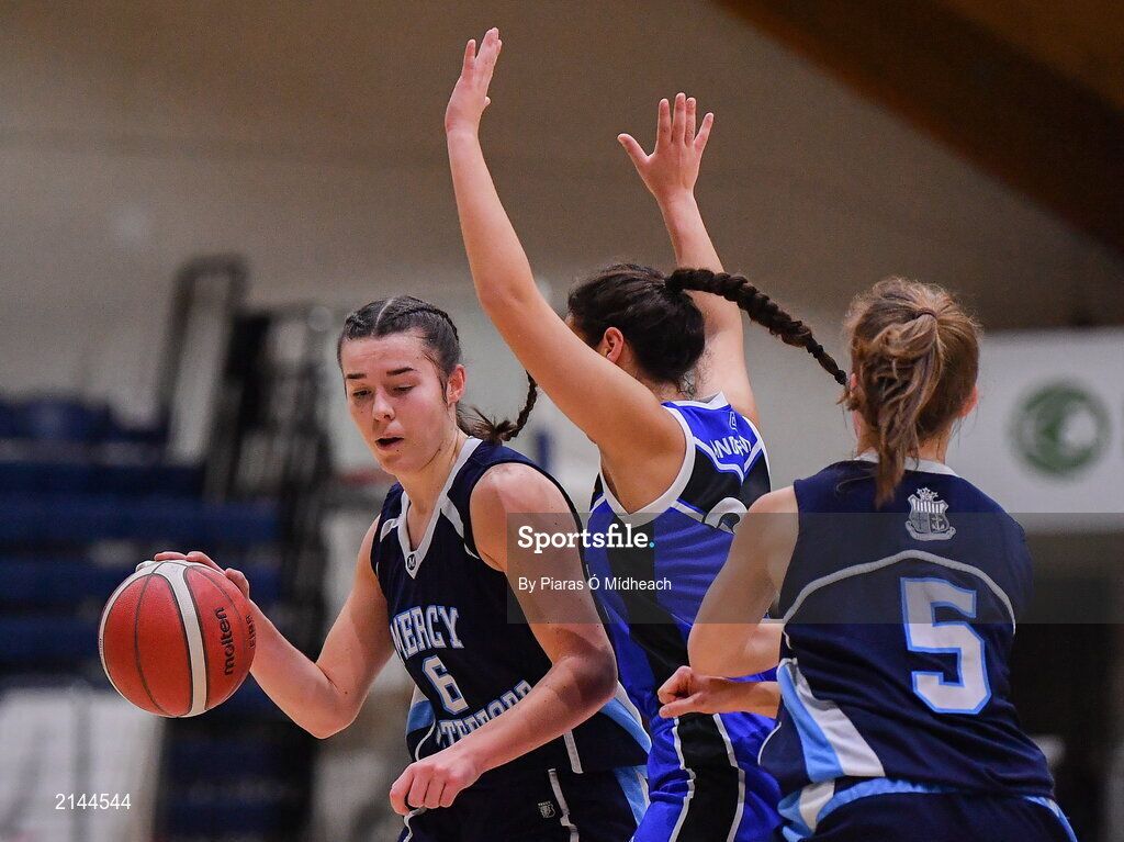 19 January 2022; Sarah Hickey Our Lady of Mercy in action against Giulia Anderlini of Loreto Abbey Dalkey during the Pinergy Basketball Ireland U19 A Girls Schools Cup Final match between Loreto Abbey Dalkey, Dublin, and Our Lady of Mercy, Waterford, at the National Basketball Arena in Dublin. Photo by Piaras Ó Mídheach/Sportsfile