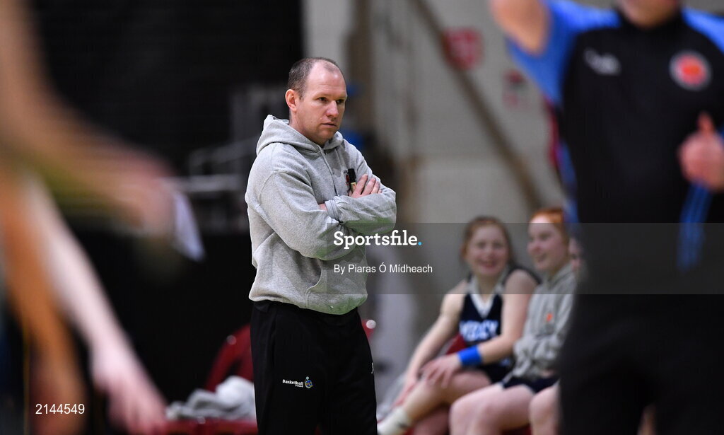19 January 2022; Our Lady of Mercy coach Tommy O’Mahony during the Pinergy Basketball Ireland U19 A Girls Schools Cup Final match between Loreto Abbey Dalkey, Dublin, and Our Lady of Mercy, Waterford, at the National Basketball Arena in Dublin. Photo by Piaras Ó Mídheach/Sportsfile