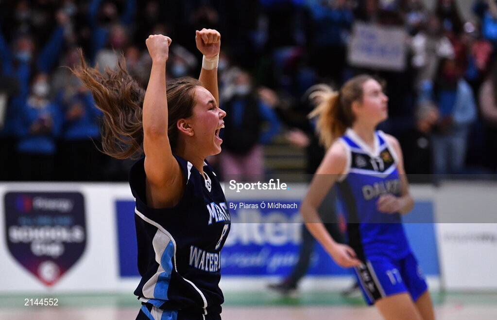 19 January 2022; Illana Fitzgerald Our Lady of Mercy celebrates after her side's victory in the Pinergy Basketball Ireland U19 A Girls Schools Cup Final match between Loreto Abbey Dalkey, Dublin, and Our Lady of Mercy, Waterford, at the National Basketball Arena in Dublin. Photo by Piaras Ó Mídheach/Sportsfile
