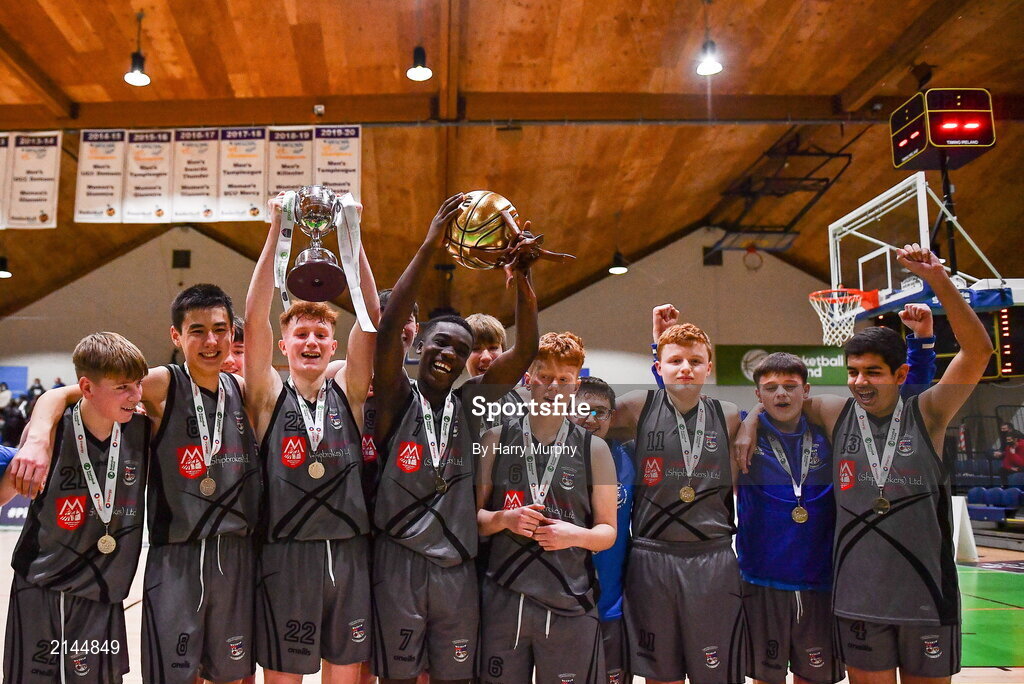 20 January 2022; Crescent Comprehensive players celebrate with the trophy after their side's victory in the Pinergy Basketball Ireland U16 B Boys Schools Cup Final match between St Louis CS, Kiltimagh, Mayo and Crescent Comprehensive, Limerick, at the National Basketball Arena in Dublin. Photo by Harry Murphy/Sportsfile