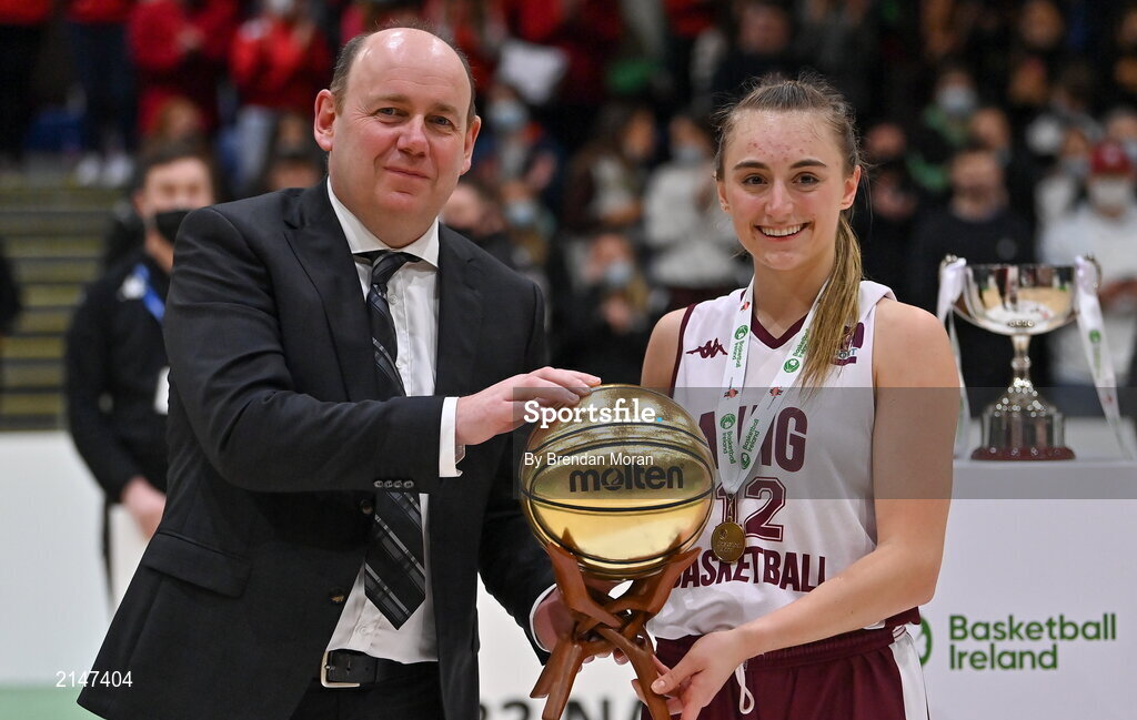 23 January 2022; Courtney Cecere of NUIG Mystics is presented with the MVP by Basketball Ireland President PJ Reidy after the InsureMyHouse.ie Women’s Division One National Cup Final match between Griffith College Templeogue, Dublin, and NUIG Mystics, Galway, at National Basketball Arena in Tallaght, Dublin. Photo by Brendan Moran/Sportsfile