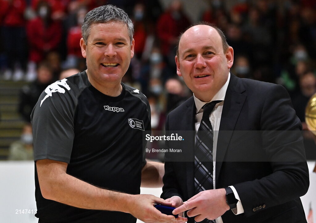 23 January 2022; Referee Joe Lavin is presented with her medal by Basketball Ireland president PJ Reidy after the InsureMyHouse.ie Women’s Division One National Cup Final match between Griffith College Templeogue, Dublin, and NUIG Mystics, Galway, at National Basketball Arena in Tallaght, Dublin. Photo by Brendan Moran/Sportsfile
