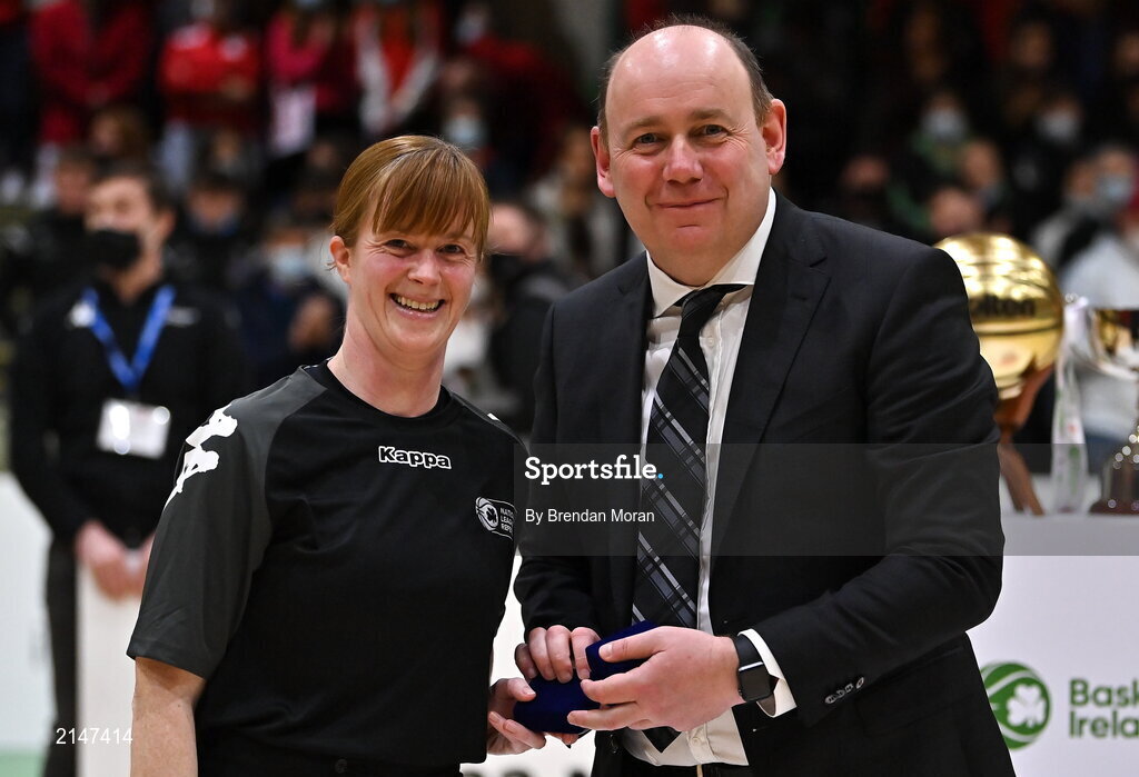 23 January 2022; Referee Emma Perry is presented with her medal by Basketball Ireland president PJ Reidy after the InsureMyHouse.ie Women’s Division One National Cup Final match between Griffith College Templeogue, Dublin, and NUIG Mystics, Galway, at National Basketball Arena in Tallaght, Dublin. Photo by Brendan Moran/Sportsfile