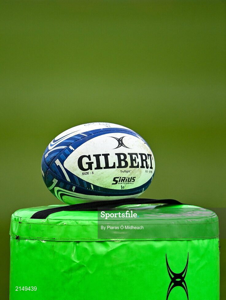 23 January 2022; A general view of a rugby ball before the Heineken Champions Cup Pool B match between Munster and Wasps at Thomond Park in Limerick. Photo by Piaras Ó Mídheach/Sportsfile