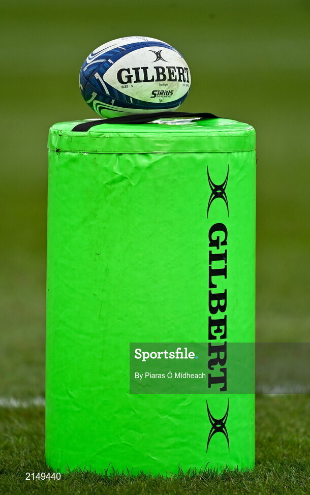 23 January 2022; A general view of a rugby ball on a tackle bag before the Heineken Champions Cup Pool B match between Munster and Wasps at Thomond Park in Limerick. Photo by Piaras Ó Mídheach/Sportsfile
