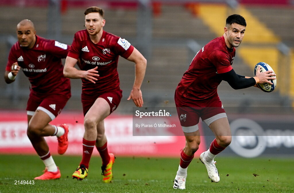 23 January 2022; Conor Murray of Munster, supported by teammates Simon Zebo, left, and Ben Healy during the Heineken Champions Cup Pool B match between Munster and Wasps at Thomond Park in Limerick. Photo by Piaras Ó Mídheach/Sportsfile