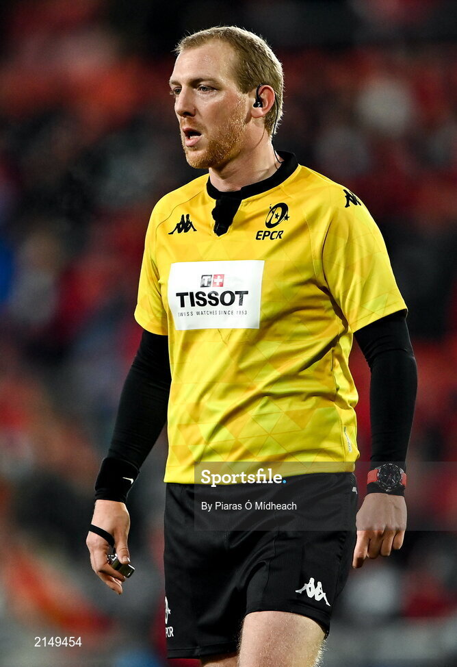23 January 2022; Referee Tual Trainini during the Heineken Champions Cup Pool B match between Munster and Wasps at Thomond Park in Limerick. Photo by Piaras Ó Mídheach/Sportsfile