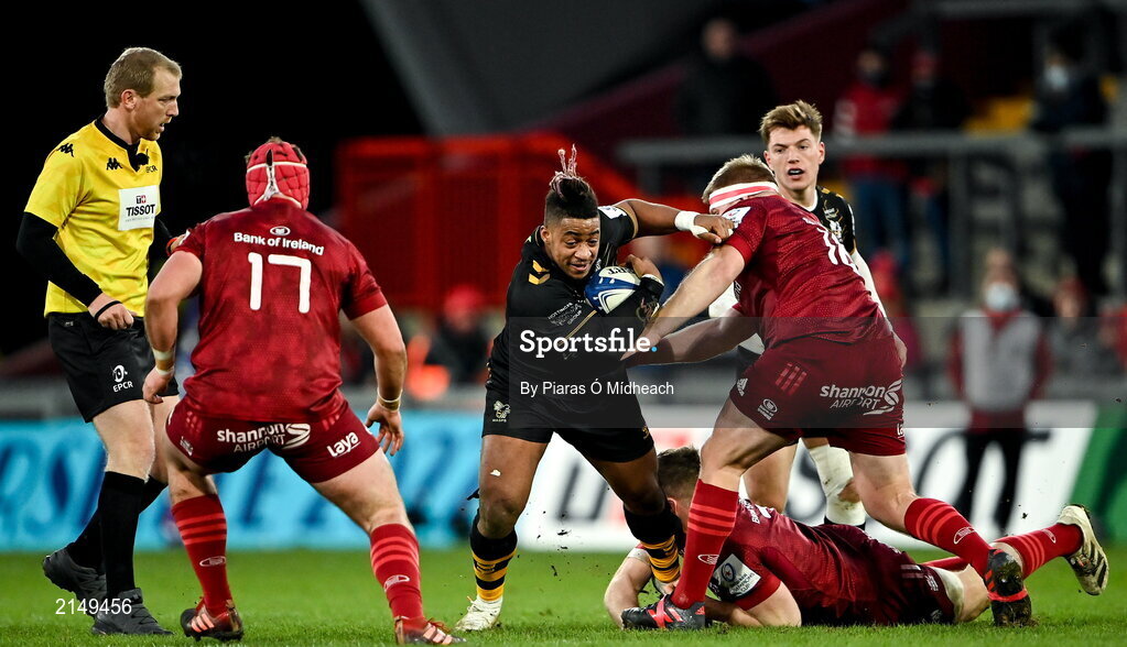 23 January 2022; Paolo Odogwu of Wasps is tackled by Munster players Jack O'Donoghue, bottom, and John Ryan during the Heineken Champions Cup Pool B match between Munster and Wasps at Thomond Park in Limerick. Photo by Piaras Ó Mídheach/Sportsfile
