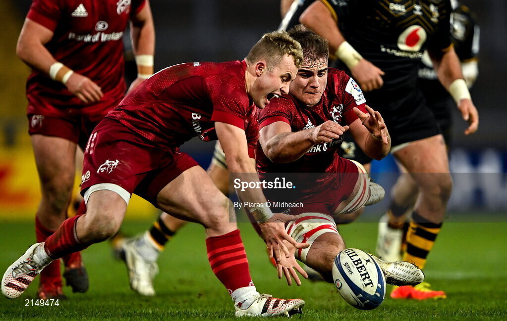 23 January 2022; Munster players Alex Kendellen, right, and Craig Casey contest for the ball during the Heineken Champions Cup Pool B match between Munster and Wasps at Thomond Park in Limerick. Photo by Piaras Ó Mídheach/Sportsfile