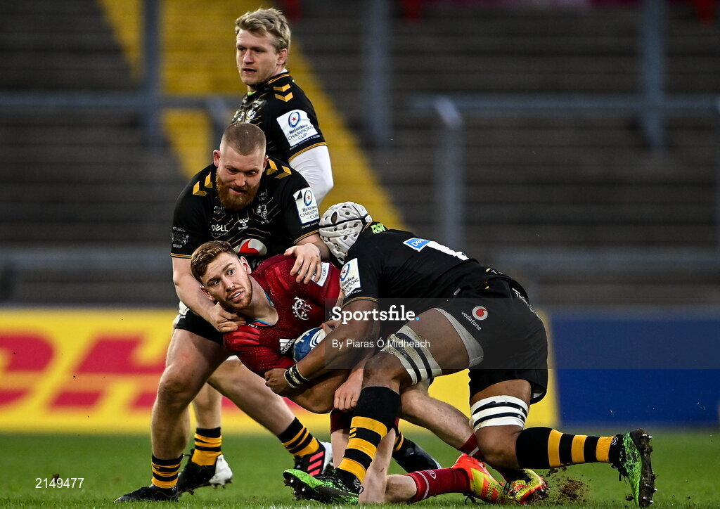 23 January 2022; Ben Healy of Munster is tackled by Wasps players Nizaam Carr, right, and Tom West of Wasps during the Heineken Champions Cup Pool B match between Munster and Wasps at Thomond Park in Limerick. Photo by Piaras Ó Mídheach/Sportsfile