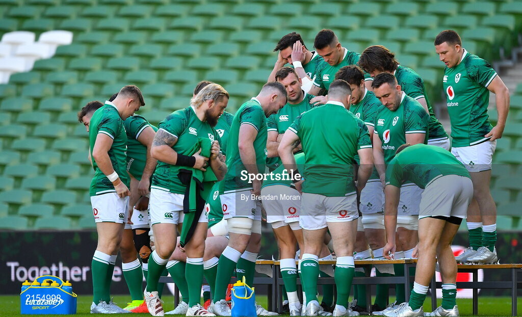 4 February 2022; The Ireland squad prepare for their squad photo before the Ireland captain's run at Aviva Stadium in Dublin. Photo by Brendan Moran/Sportsfile
