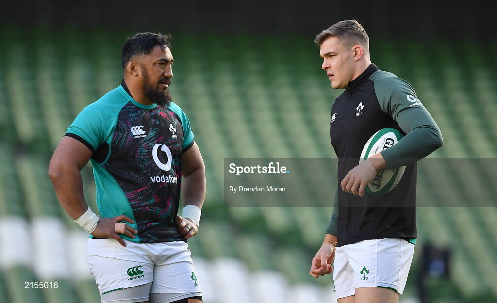 4 February 2022; Bundee Aki, left, and Garry Ringrose during the Ireland captain's run at Aviva Stadium in Dublin. Photo by Brendan Moran/Sportsfile