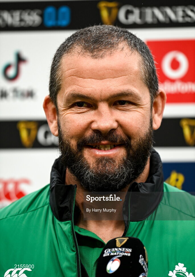 5 February 2022; Ireland head coach Andy Farrell is interviewed before the Guinness Six Nations Rugby Championship match between Ireland and Wales at the Aviva Stadium in Dublin. Photo by Harry Murphy/Sportsfile