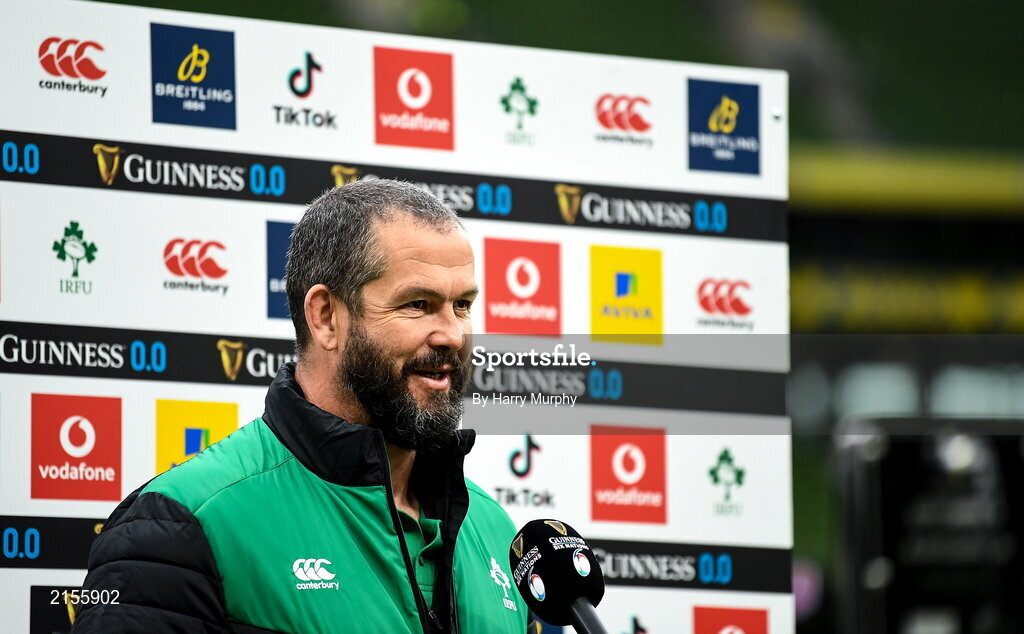 5 February 2022; Ireland head coach Andy Farrell is interviewed before the Guinness Six Nations Rugby Championship match between Ireland and Wales at the Aviva Stadium in Dublin. Photo by Harry Murphy/Sportsfile