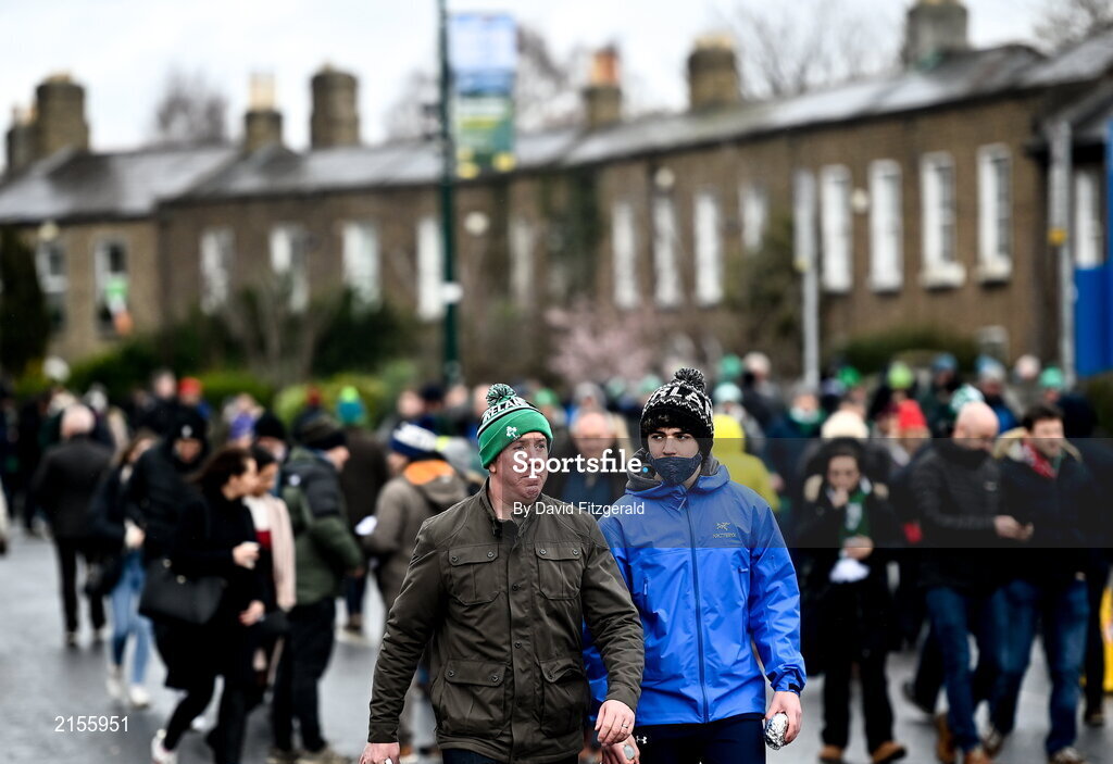 5 February 2022; Supporters arrive before the Guinness Six Nations Rugby Championship match between Ireland and Wales at the Aviva Stadium in Dublin. Photo by David Fitzgerald/Sportsfile