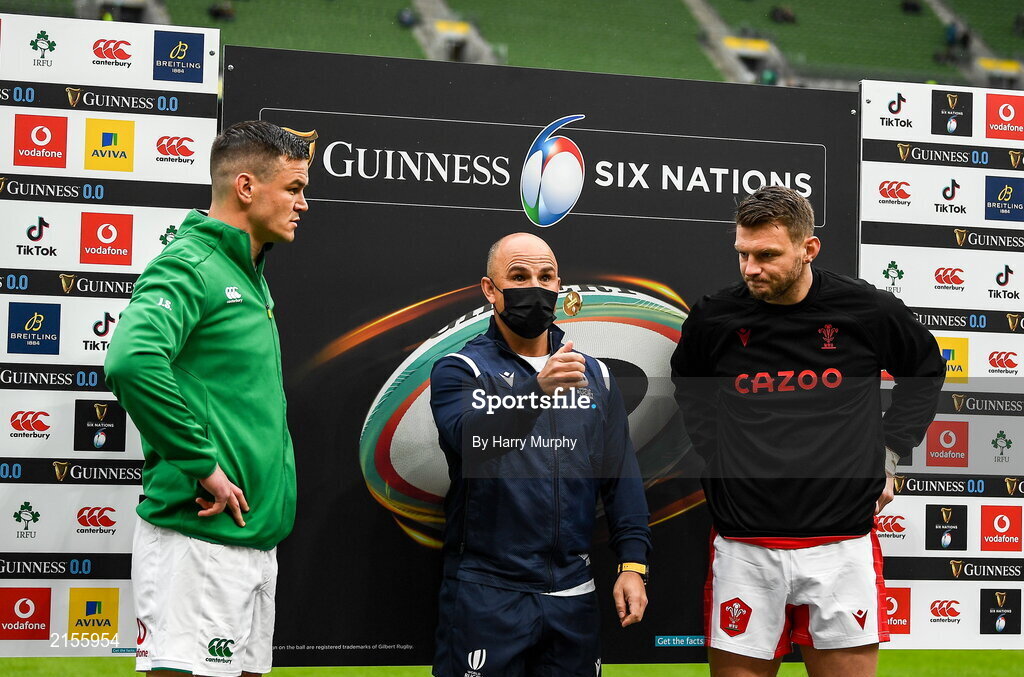 5 February 2022; Referee Jaco Peyper makes the toss in the presence of Ireland captain Jonathan Sexton, left, and Wales captain Dan Biggar the Guinness Six Nations Rugby Championship match between Ireland and Wales at the Aviva Stadium in Dublin. Photo by Harry Murphy/Sportsfile