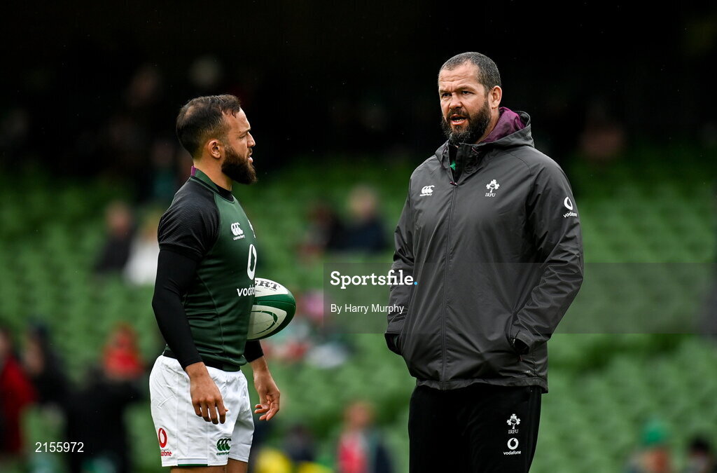 5 February 2022; Ireland head coach Andy Farrell, right, in conversation with Jamison Gibson Park of Ireland before the Guinness Six Nations Rugby Championship match between Ireland and Wales at the Aviva Stadium in Dublin. Photo by Harry Murphy/Sportsfile