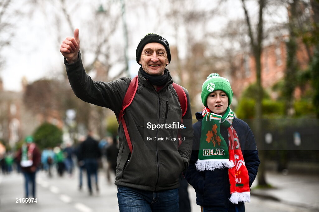 5 February 2022; Supporters arrive before the Guinness Six Nations Rugby Championship match between Ireland and Wales at the Aviva Stadium in Dublin. Photo by David Fitzgerald/Sportsfile
