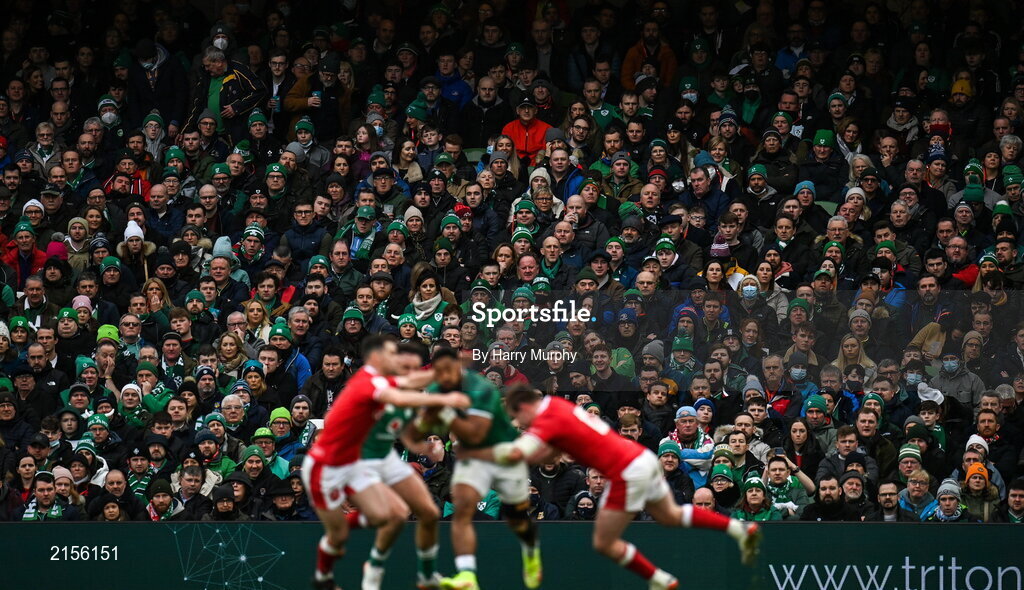 5 February 2022; Supporters watch on during the Guinness Six Nations Rugby Championship match between Ireland and Wales at the Aviva Stadium in Dublin. Photo by Harry Murphy/Sportsfile