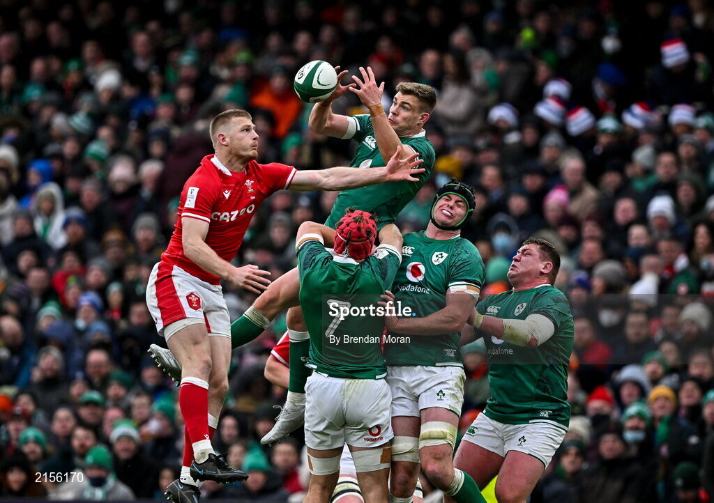 5 February 2022; Garry Ringrose of Ireland gains possession ahead of Will Rowlands of Wales during the Guinness Six Nations Rugby Championship match between Ireland and Wales at the Aviva Stadium in Dublin. Photo by Brendan Moran/Sportsfile