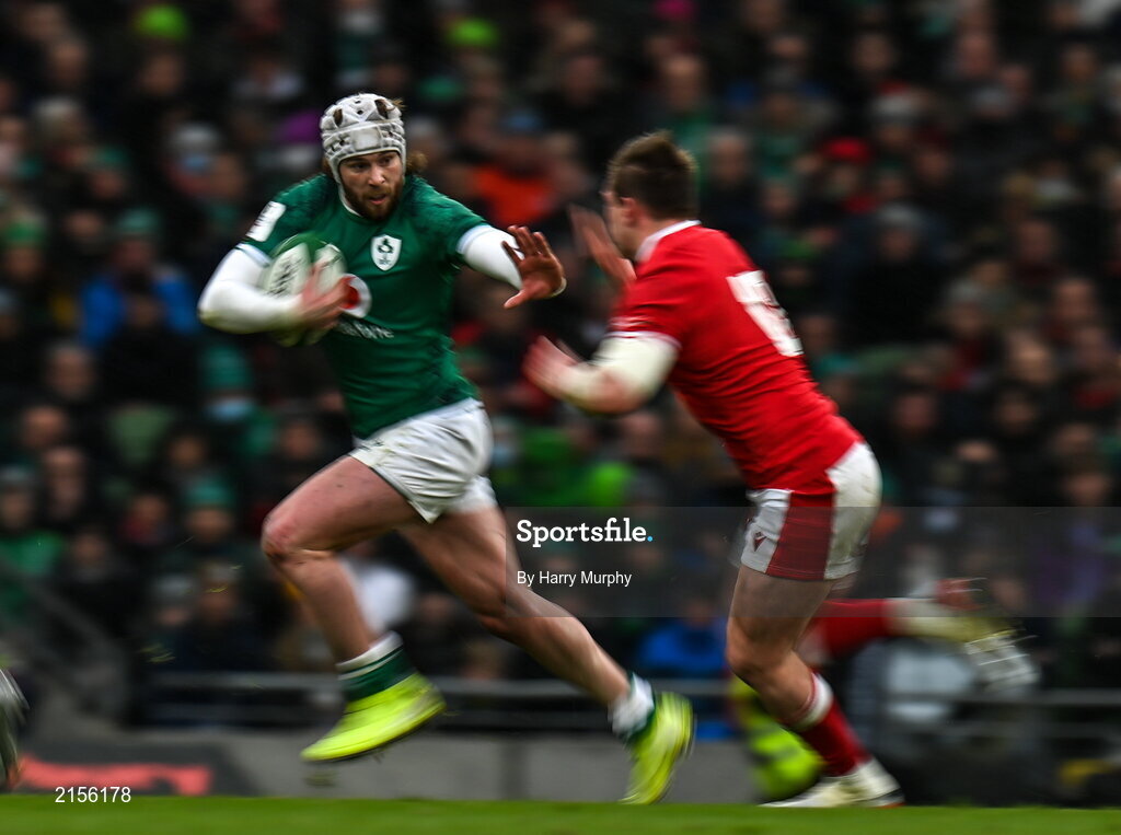 5 February 2022; Mack Hansen of Ireland makes a break during the Guinness Six Nations Rugby Championship match between Ireland and Wales at the Aviva Stadium in Dublin. Photo by Harry Murphy/Sportsfile