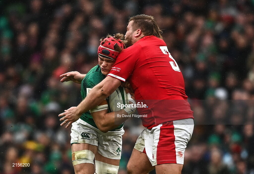 5 February 2022; Josh van der Flier of Ireland is tackled by Tomas Francis of Wales during the Guinness Six Nations Rugby Championship match between Ireland and Wales at the Aviva Stadium in Dublin. Photo by David Fitzgerald/Sportsfile