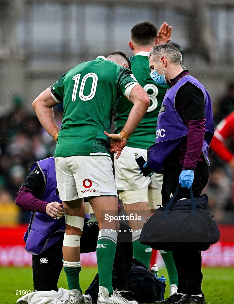 5 February 2022; Jonathan Sexton of Ireland receives medical attention during the Guinness Six Nations Rugby Championship match between Ireland and Wales at the Aviva Stadium in Dublin. Photo by Brendan Moran/Sportsfile