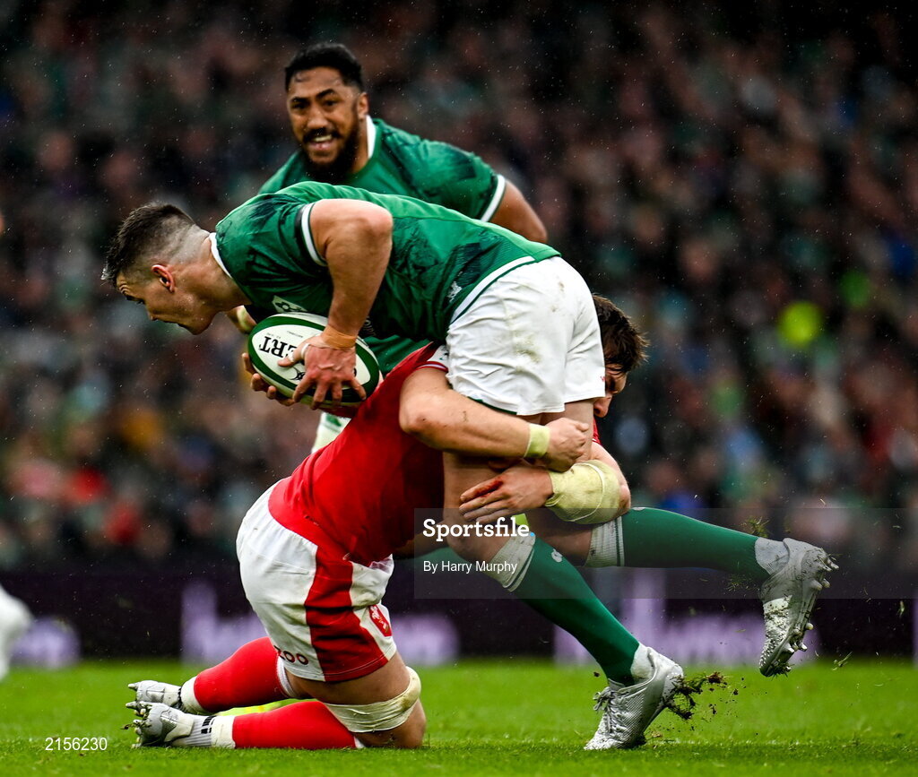 5 February 2022; Jonathan Sexton of Ireland is tackled by Taine Basham of Wales during the Guinness Six Nations Rugby Championship match between Ireland and Wales at the Aviva Stadium in Dublin. Photo by Harry Murphy/Sportsfile