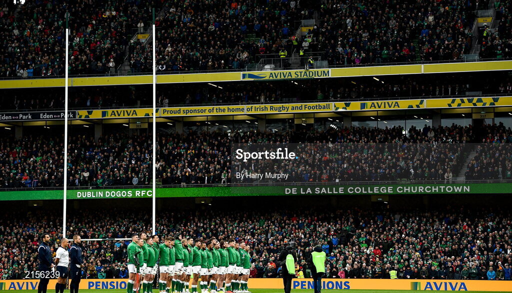 5 February 2022; Ireland players stand for the national anthem before the Guinness Six Nations Rugby Championship match between Ireland and Wales at the Aviva Stadium in Dublin. Photo by Harry Murphy/Sportsfile