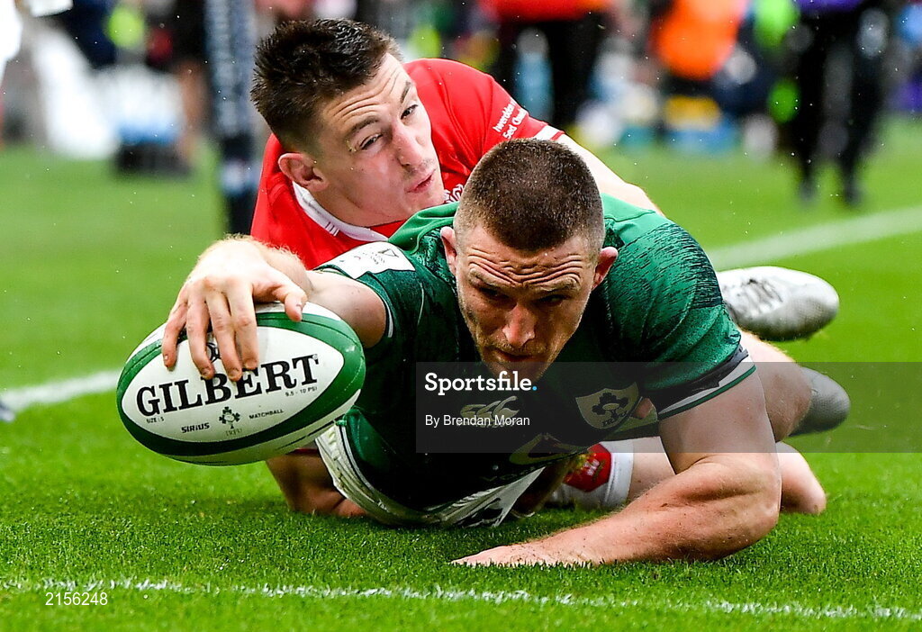 5 February 2022; Andrew Conway of Ireland dives over to score his side's second try during the Guinness Six Nations Rugby Championship match between Ireland and Wales at the Aviva Stadium in Dublin. Photo by Brendan Moran/Sportsfile