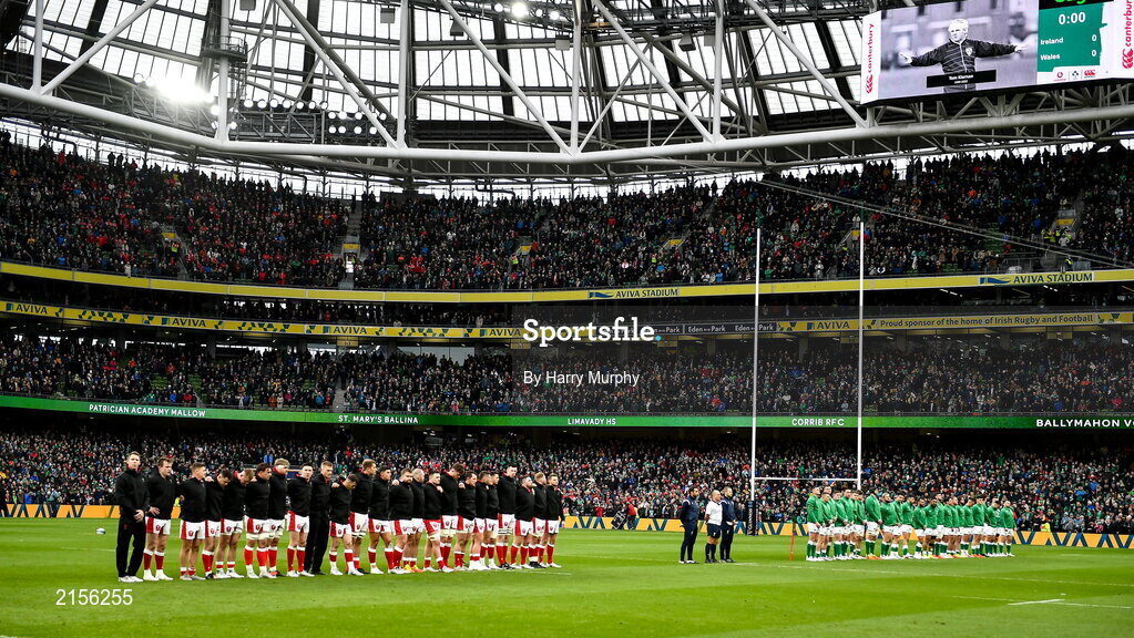5 February 2022; Both teams stand for a minute's silence in memory of the late Tom Kiernan during the Guinness Six Nations Rugby Championship match between Ireland and Wales at the Aviva Stadium in Dublin. Photo by Harry Murphy/Sportsfile