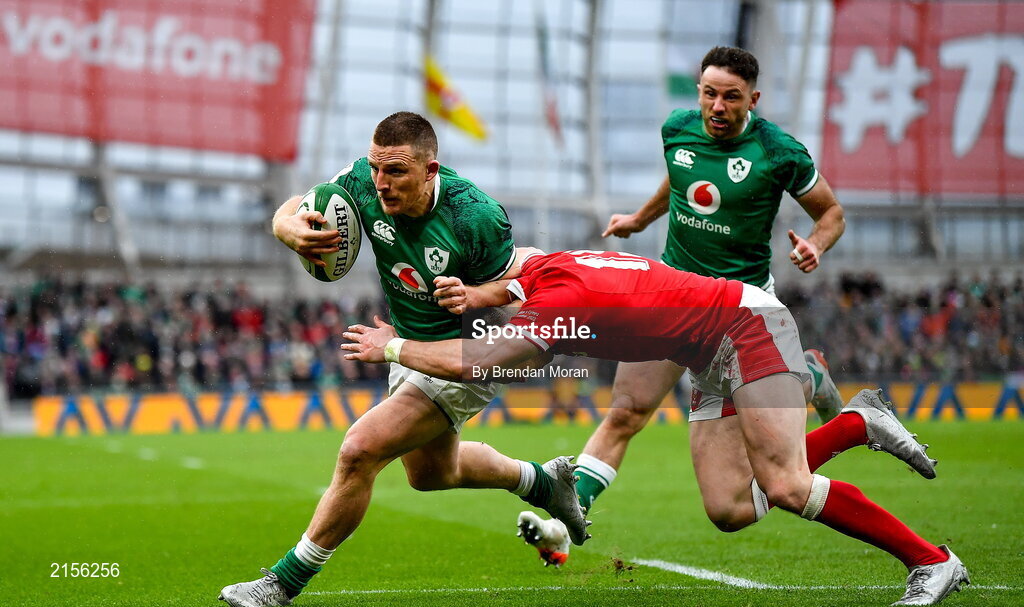 5 February 2022; Andrew Conway of Ireland beats the tackle of Josh Adams of Wales on his way to scoring his side's second try during the Guinness Six Nations Rugby Championship match between Ireland and Wales at the Aviva Stadium in Dublin. Photo by Brendan Moran/Sportsfile